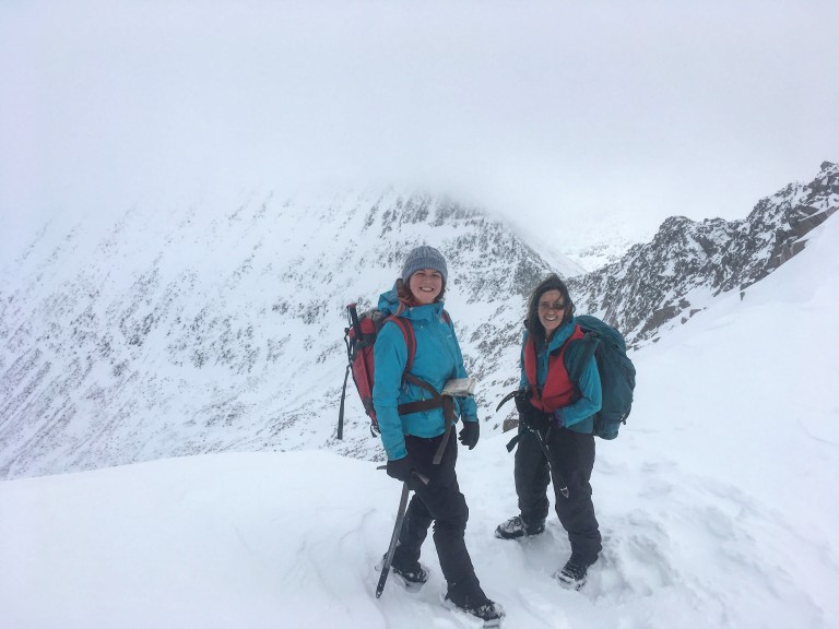 With the girls having learnt loads the previous day, and being confidant on their feet from lots of climbing experience, day 2 was to be the Carn Mor Dearg arête and up and over the Ben. Despite having the key for the upper car park the walk up to the ridge still seemed a long way! Along the way we looked at a fair bit of fauna and flora, and the difference in the snow conditions from the previous day. The arête was in perfect condition; snow, dry rock and windless… A really nice walk was had, but the view soon dissapeared once in the summit of the Ben! With a bit of navigation on the way down with the classic dog-leg bearing off the Ben, we wrapped up a thoroughly enjoyable day!  Great effort from the team over a long day!